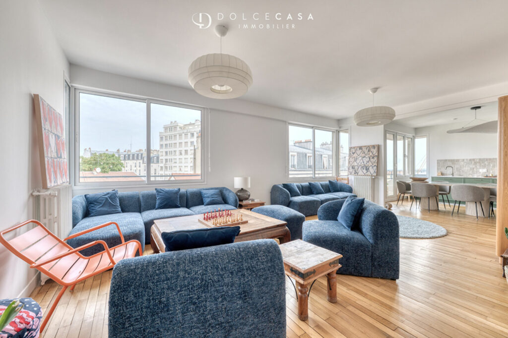 Cet appartement en duplex de 135 m² Loi Carrez et 151 m² au sol vous offre au premier niveau une entrée avec dressing, une belle pièce de vie lumineuse de 46 m² avec cuisine ouverte aménagée et équipée, et une salle de bains avec WC. A l’étage, quatre chambres, une salle de bains, un coin bureau et un WC séparé. Excellent état général.