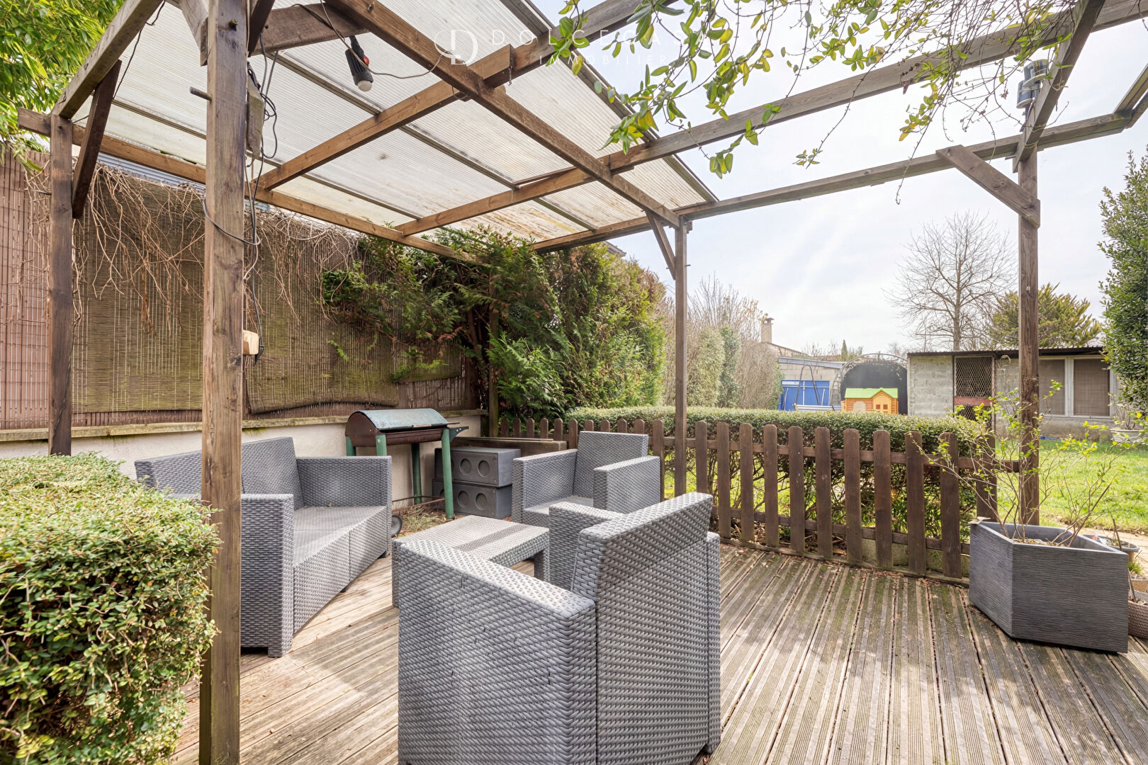 A l’extérieur, vous bénéficiez de deux terrasses, d’un jardin soigné sans vis-à-vis, d’un abri de jardin et d’un espace pour deux véhicules.